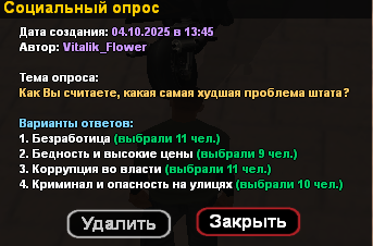🧑✈️ "Самое страшное — это коррупция. Она мешает развитию штата и разрушает доверие к власти. Пока не будет честности — ничего не изменится," — отметил участник опроса Rey из San Fiero.